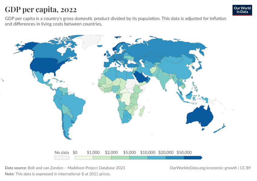GDP per capita is a very comprehensive measure of people’s average income. This indicator reveals how large the inequality between people in different countries is. In the poorest countries, people live on less than $1,000 per year, while in rich countries, the average income is more than 50 times higher.