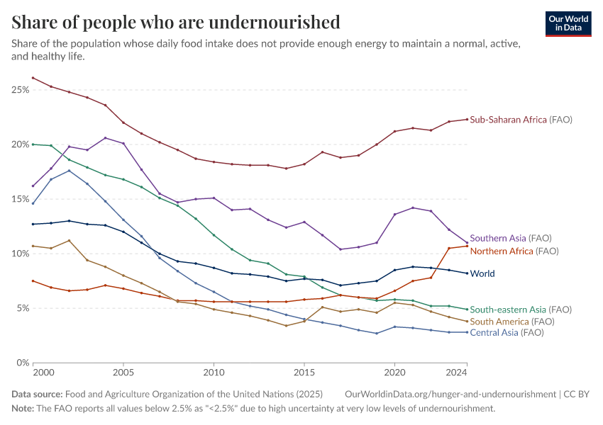 The UN’s Food and Agriculture Organization publishes global data on undernourishment, defined as not consuming enough calories to maintain a normal, active, healthy life. These minimum requirements vary by a person’s sex, weight, height, and activity levels. This is considered in these national and global estimates.