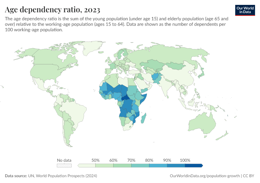 But we see big differences across the world. The ratio is much higher across many countries in Sub-Saharan Africa: several countries have a dependent population around the same size or larger than their working-age populations.