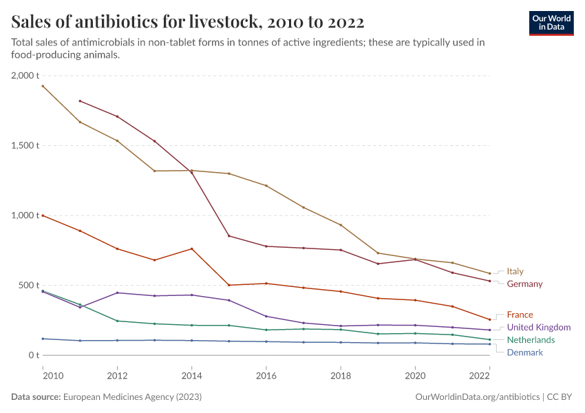 The chart below shows that antibiotic sales for livestock have dropped significantly in several European countries.