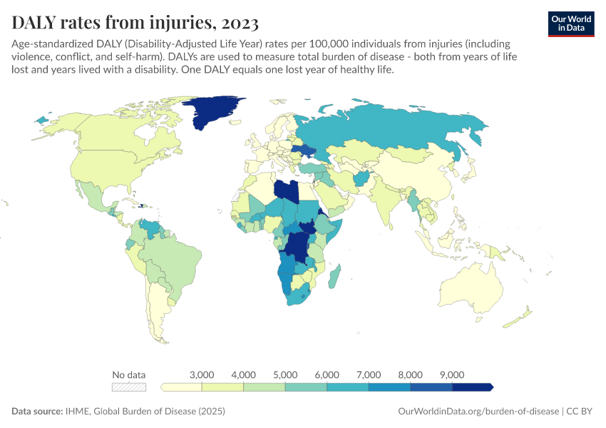 This map shows the annual rate of DALYs per 100,000 people in the population. It is thereby measuring the distribution of the burden of both mortality and morbidity around the world.
