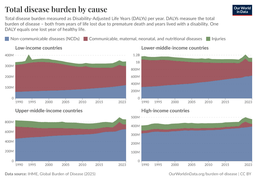 In high-income nations, non-communicable diseases account for a large share of the overall burden of disease. In contrast, communicable diseases tend to make a small share. This is shown below.
