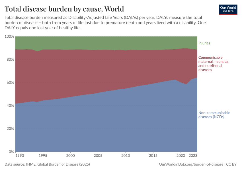 The chart also shows a notable shift since 1990, when communicable diseases held the highest share of the disease burden.