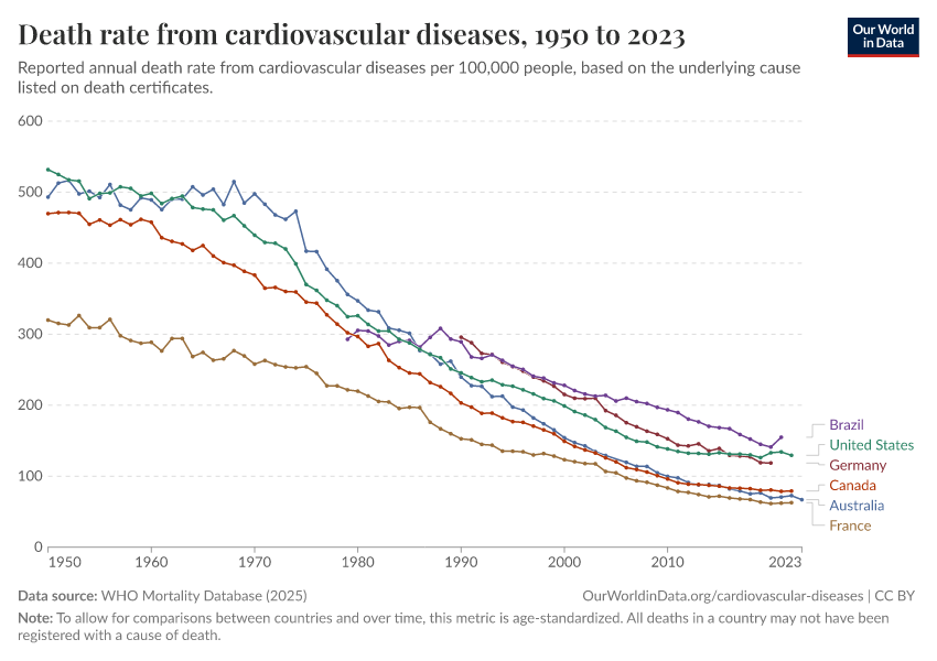 Saloni Dattani (2025) - “Death rates from cardiovascular disease have fallen dramatically — what were the breakthroughs behind this?” Published online at OurWorldinData.org. Retrieved from: 'https://gfs-wave-2-new.owid.pages.dev:8789/20260319-180137/cardiovascular-deaths-decline.html' [Online Resource] (archived on March 19, 2026).BibTeX citation