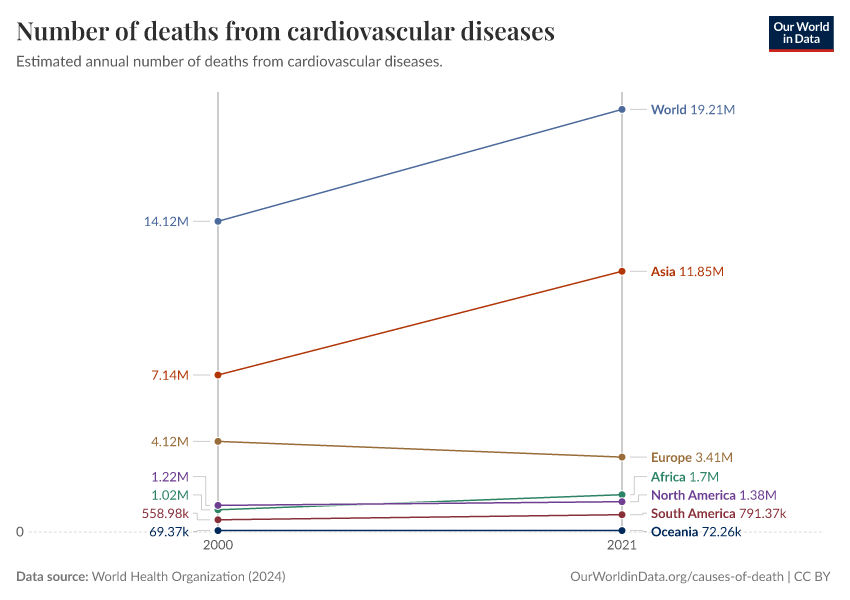 In 2000, around 14 million people died from cardiovascular diseases globally, while in 2019, close to 18 million died.