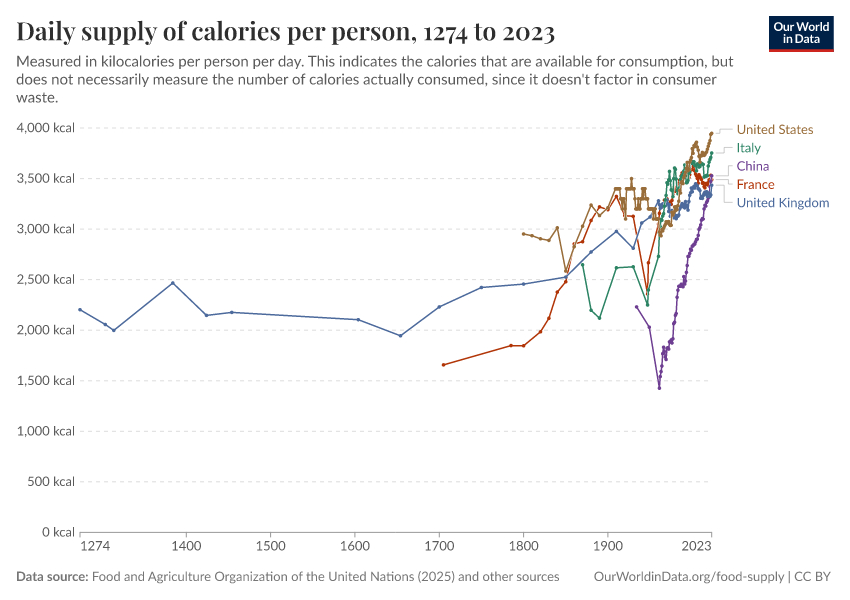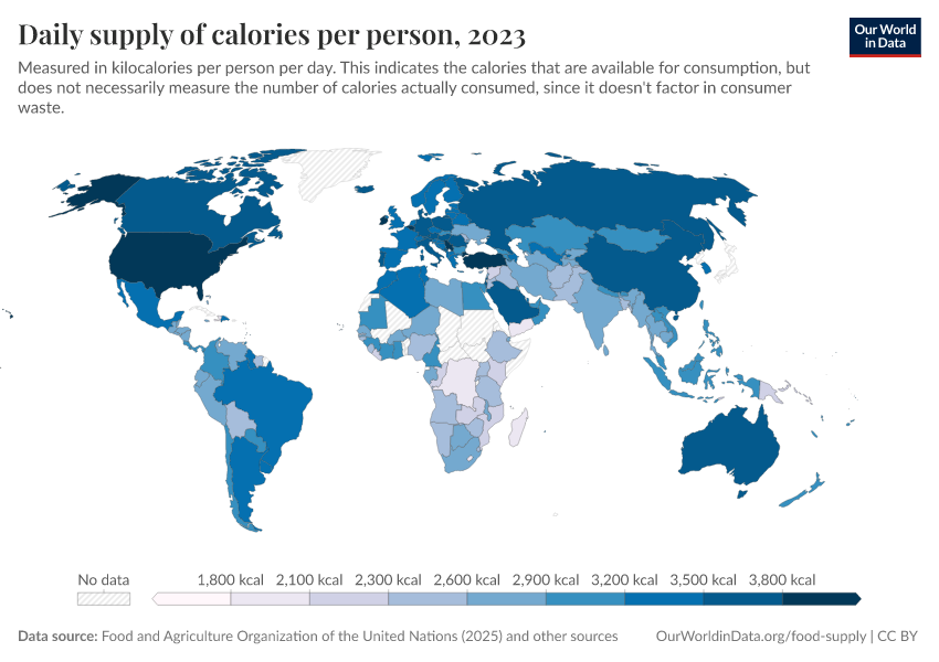 Max Roser, Hannah Ritchie, and Pablo Rosado (2013) - “Food Supply” Published online at OurWorldinData.org. Retrieved from: 'https://gfs-wave-2-new.owid.pages.dev/food-supply' [Online Resource]BibTeX citation