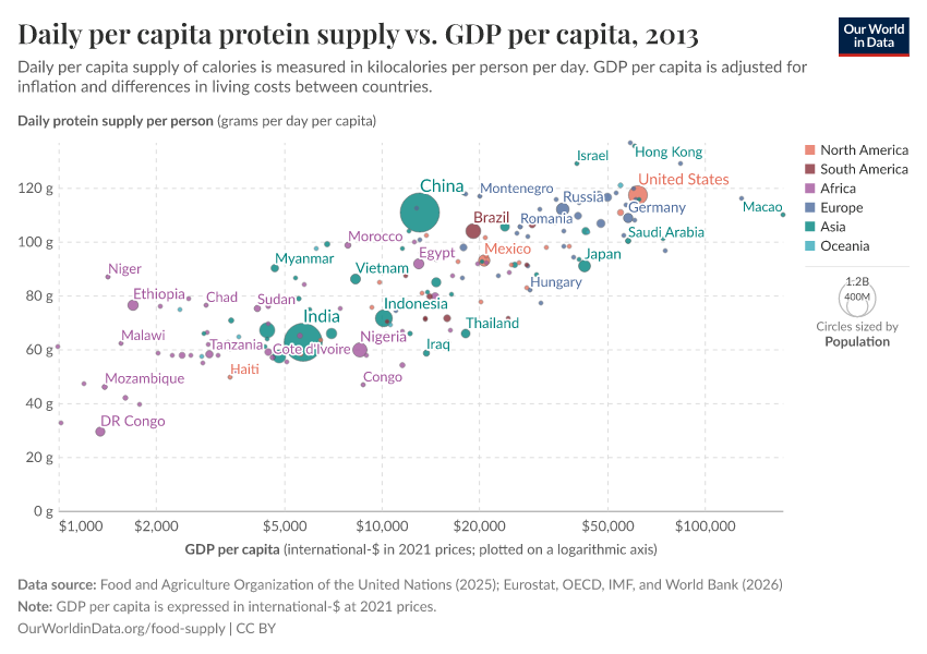 In the sub-sections below we have plotted the relationship between daily per capita food supply (in the form of calories, protein, and then fat) versus gross domestic product (GDP) per capita in 2011 international-$. Several countries selected across a range of income levels and global regions have been highlighted for comparison. For all three measures of food supply, we see a close correlation between per capita supply and prosperity. As we get richer, per capita supply tends to increase.