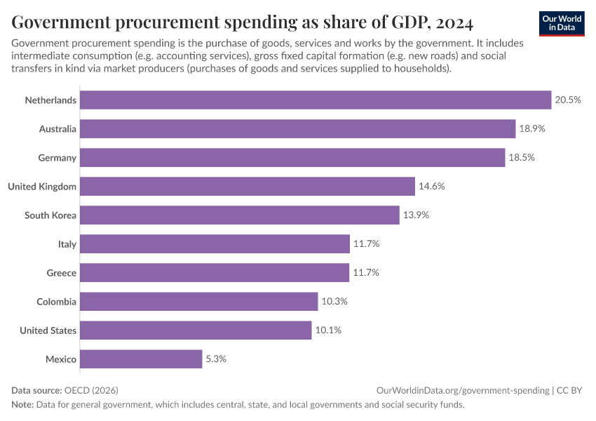 The chart shows the importance of public procurement in OECD countries (and partner countries providing comparable data). It shows the value of government spending on procurement as a share of GDP.