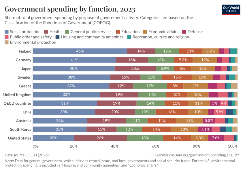 The chart shows how governments divide total spending across ten categories.1 You can also see spending in these categories as a share of GDP.