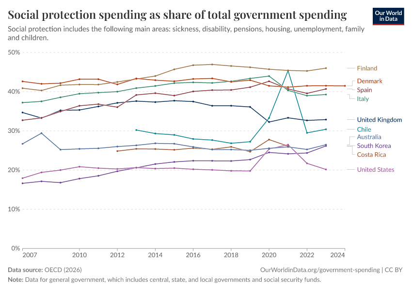 The chart here shows spending on social protection as a share of total government spending for OECD countries. As we can see, there are also large differences across OECD countries themselves.