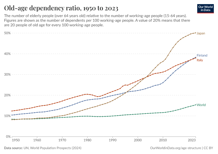 “Data Page: Old-age dependency ratio, age old”. Our World in Data (2026). Data adapted from United Nations. Retrieved from https://gfs-wave-2-new.owid.pages.dev:8789/20260402-160819/grapher/age-dependency-ratio-old.html [online resource] (archived on April 2, 2026).How to cite this data
