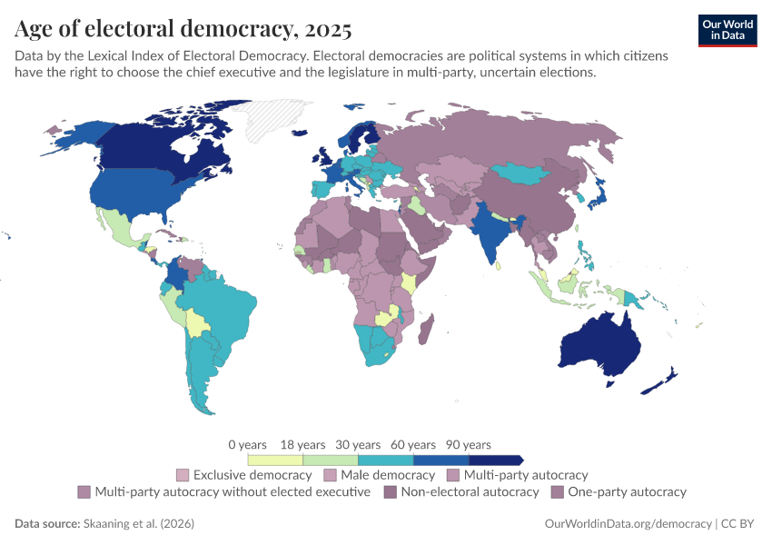 “Data Page: Age of electoral democracy”, part of the following publication: Bastian Herre, Lucas Rodés-Guirao, and Esteban Ortiz-Ospina (2013) - “Democracy”. Data adapted from Skaaning et al.. Retrieved from https://gfs-wave-2-new.owid.pages.dev:8789/20260402-174958/grapher/age-of-electoral-democracy-lexical.html [online resource] (archived on April 2, 2026).How to cite this data