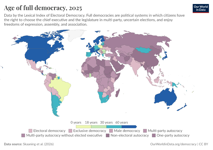 Skaaning et al. (2026) – processed by Our World in Data. “Age of full democracy” [dataset]. Skaaning et al., “Lexical Index of Electoral Democracy (LIED) v6.9” [original data]. Retrieved April 10, 2026 from https://gfs-wave-2-new.owid.pages.dev:8789/20260402-174958/grapher/age-of-full-democracy.html (archived on April 2, 2026).Download