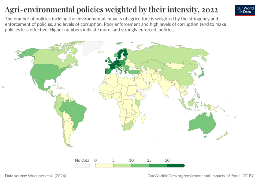 “Data Page: Agri-environmental policies weighted by their intensity”. Our World in Data (2026). Data adapted from Wuepper et al. (2024). Retrieved from https://gfs-wave-2-new.owid.pages.dev:8789/20260304-094028/grapher/agri-environmental-policies-intensity.html [online resource] (archived on March 4, 2026).How to cite this data