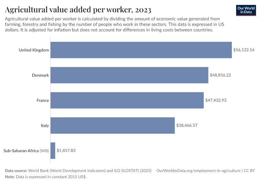 “Data Page: Agricultural value added per worker”. Our World in Data (2026). Data adapted from World Bank (World Development Indicators) and ILO (ILOSTAT). Retrieved from https://gfs-wave-2-new.owid.pages.dev:8789/20260304-094028/grapher/agriculture-value-added-per-worker-wdi.html [online resource] (archived on March 4, 2026).