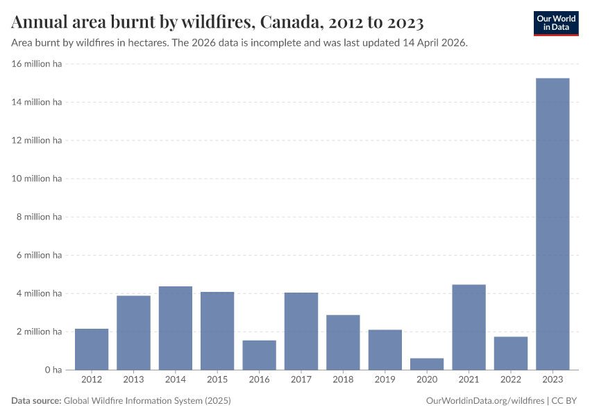 Global Wildfire Information System (2026); Global Wildfire Information System (2024) – with minor processing by Our World in Data. “Annual area burnt by wildfires” [dataset]. Global Wildfire Information System, “Seasonal wildfire trends” [original data]. Retrieved April 10, 2026 from https://gfs-wave-2-new.owid.pages.dev:8789/20260326-144924/grapher/annual-area-burnt-by-wildfires.html (archived on March 26, 2026).Download