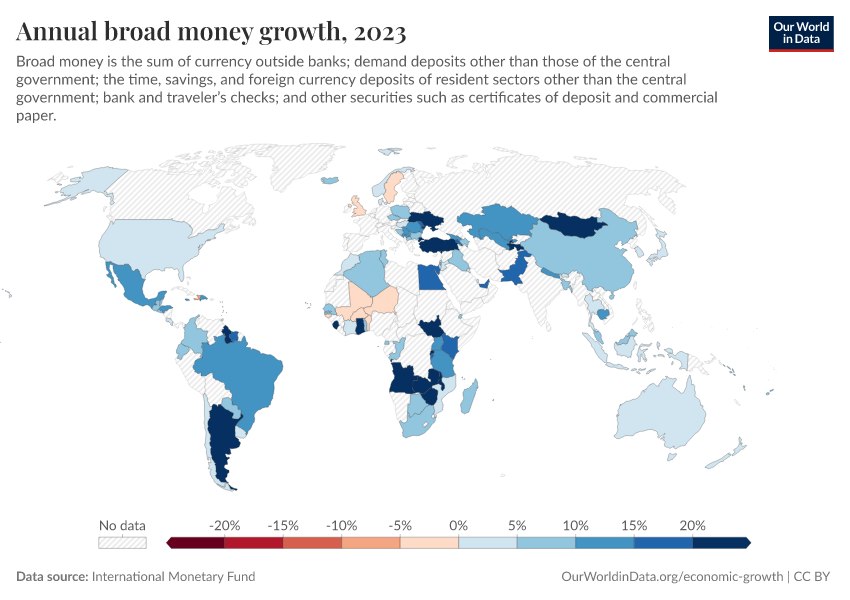 International Monetary Fund – processed by Our World in Data. “Annual broad money growth” [dataset]. International Monetary Fund, “International Monetary Fund, International Financial Statistics and data files.” [original data]. Retrieved April 10, 2026 from https://gfs-wave-2-new.owid.pages.dev:8789/20260304-094028/grapher/annual-broad-money-growth.html (archived on March 4, 2026).Download
