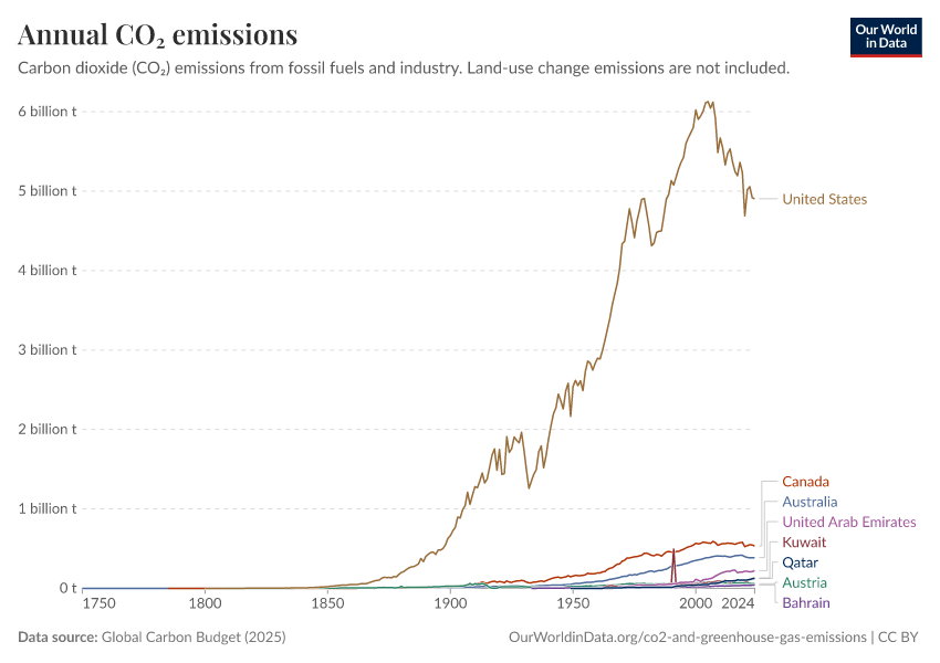 Global Carbon Budget (2025) – with major processing by Our World in Data. “Annual CO₂ emissions” [dataset]. Global Carbon Project, “Global Carbon Budget v15” [original data]. Retrieved April 10, 2026 from https://gfs-wave-2-new.owid.pages.dev:8789/20260304-094028/grapher/annual-co2-emissions-per-country.html (archived on March 4, 2026).