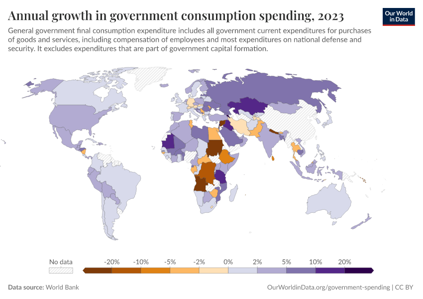 “Data Page: Annual growth in government consumption spending”. Our World in Data (2026). Data adapted from World Bank. Retrieved from https://gfs-wave-2-new.owid.pages.dev:8789/20260304-094028/grapher/annual-growth-of-general-government-final-consumption-expenditure.html [online resource] (archived on March 4, 2026).How to cite this data