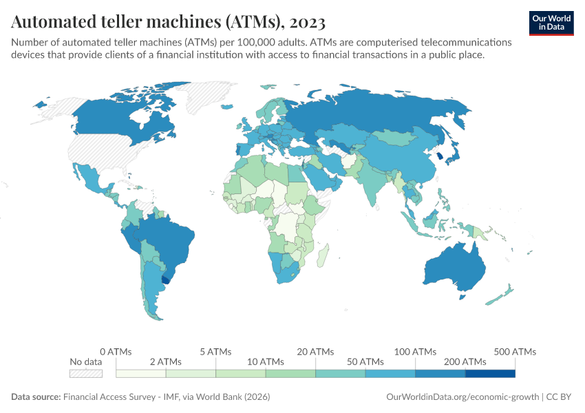 “Data Page: Automated teller machines (ATMs)”. Our World in Data (2026). Data adapted from Financial Access Survey - IMF, via World Bank. Retrieved from https://gfs-wave-2-new.owid.pages.dev:8789/20260304-094028/grapher/automated-teller-machines-atms-per-100000-adults.html [online resource] (archived on March 4, 2026).How to cite this data