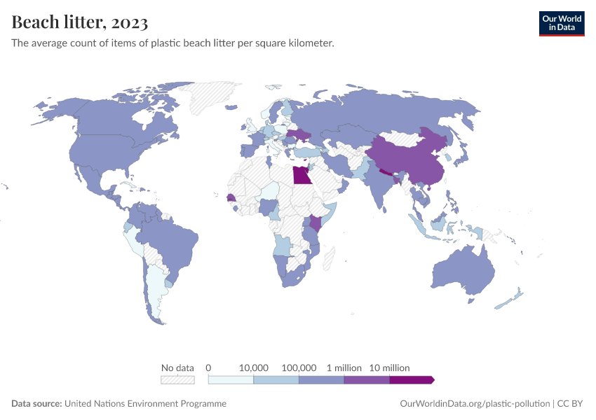“Data Page: Beach litter”. Our World in Data (2026). Data adapted from United Nations Environment Programme. Retrieved from https://gfs-wave-2-new.owid.pages.dev:8789/20260330-194822/grapher/beach-litter.html [online resource] (archived on March 30, 2026).How to cite this data