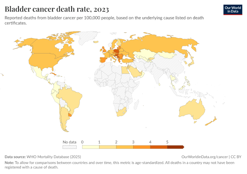 “Data Page: Bladder cancer death rate”, part of the following publication: Saloni Dattani, Fiona Spooner, Hannah Ritchie, and Max Roser (2023) - “Causes of Death”. Data adapted from WHO Mortality Database. Retrieved from https://gfs-wave-2-new.owid.pages.dev:8789/20260304-094028/grapher/bladder-cancer-death-rate.html [online resource] (archived on March 4, 2026).How to cite this data