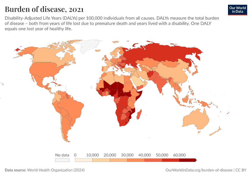 World Health Organization (2024) – with major processing by Our World in Data. “Burden of disease” [dataset]. World Health Organization, “Global Health Estimates” [original data]. Retrieved April 10, 2026 from https://gfs-wave-2-new.owid.pages.dev:8789/20260325-171315/grapher/burden-of-disease-who.html (archived on March 25, 2026).Download