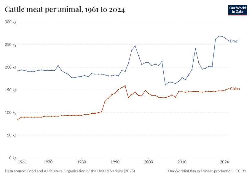 Food and Agriculture Organization of the United Nations (2025) – with major processing by Our World in Data. “Cattle meat yield per animal – UN FAO” [dataset]. Food and Agriculture Organization of the United Nations, “Production: Crops and livestock products” [original data]. Retrieved April 10, 2026 from https://gfs-wave-2-new.owid.pages.dev:8789/20260304-094028/grapher/cattle-meat-yields-hectograms-100-grams-per-animal.html (archived on March 4, 2026).