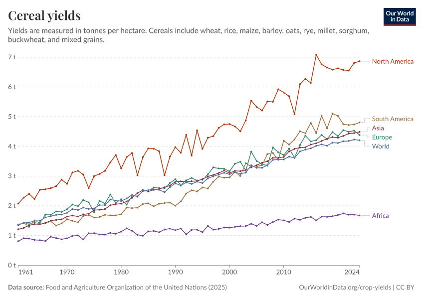 Food and Agriculture Organization of the United Nations (2025) – with major processing by Our World in Data. “Cereal yields – UN FAO” [dataset]. Food and Agriculture Organization of the United Nations, “Production: Crops and livestock products” [original data]. Retrieved April 10, 2026 from https://gfs-wave-2-new.owid.pages.dev:8789/20260331-145632/grapher/cereal-yield.html (archived on March 31, 2026).Download