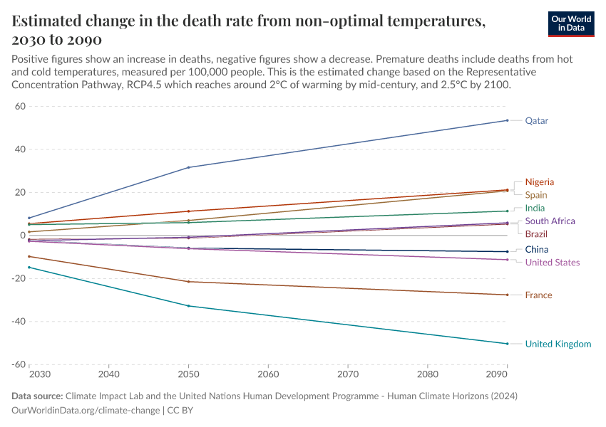 “Data Page: Estimated change in the death rate from non-optimal temperatures”. Our World in Data (2026). Data adapted from Climate Impact Lab and the United Nations Human Development Programme. Retrieved from https://gfs-wave-2-new.owid.pages.dev:8789/20260304-094028/grapher/change-heat-death-rate.html [online resource] (archived on March 4, 2026).How to cite this data