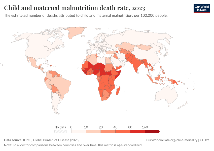 IHME, Global Burden of Disease (2025) – with major processing by Our World in Data. “Child and maternal malnutrition death rate – IHME” [dataset]. IHME, Global Burden of Disease, “Global Burden of Disease - Risk Factors - Deaths” [original data]. Retrieved April 10, 2026 from https://gfs-wave-2-new.owid.pages.dev:8789/20260319-180505/grapher/child-and-maternal-malnutrition-death-rate.html (archived on March 19, 2026).
