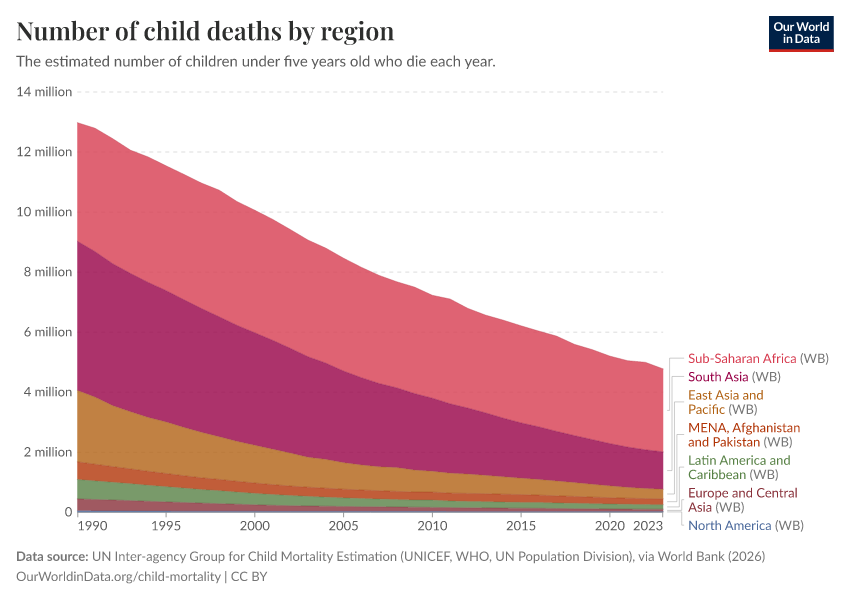 “Data Page: Number of child deaths by region”. Our World in Data (2026). Data adapted from UN Inter-agency Group for Child Mortality Estimation (UNICEF, WHO, UN Population Division), via World Bank. Retrieved from https://gfs-wave-2-new.owid.pages.dev:8789/20260304-094028/grapher/child-deaths-igme-data.html [online resource] (archived on March 4, 2026).How to cite this data