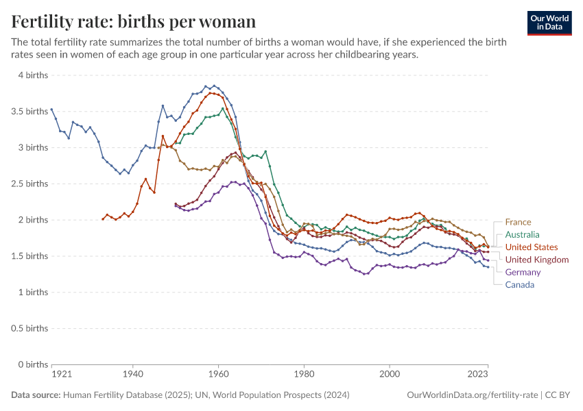 Human Fertility Database (2025); UN, World Population Prospects (2024) – with major processing by Our World in Data. “Fertility rate: births per woman – HFD, UN WPP – period tables” [dataset]. Human Fertility Database, “Human Fertility Database”; United Nations, “World Population Prospects”; United Nations, “World Population Prospects - Interim Update” [original data]. Retrieved April 10, 2026 from https://gfs-wave-2-new.owid.pages.dev:8789/20260402-163007/grapher/children-born-per-woman.html (archived on April 2, 2026).Download
