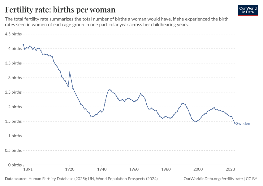 “Data Page: Fertility rate: births per woman”, part of the following publication: Saloni Dattani, Lucas Rodés-Guirao, and Max Roser (2025) - “Fertility Rate”. Data adapted from Human Fertility Database, United Nations. Retrieved from https://gfs-wave-2-new.owid.pages.dev:8789/20260402-163007/grapher/children-born-per-woman.html [online resource] (archived on April 2, 2026).