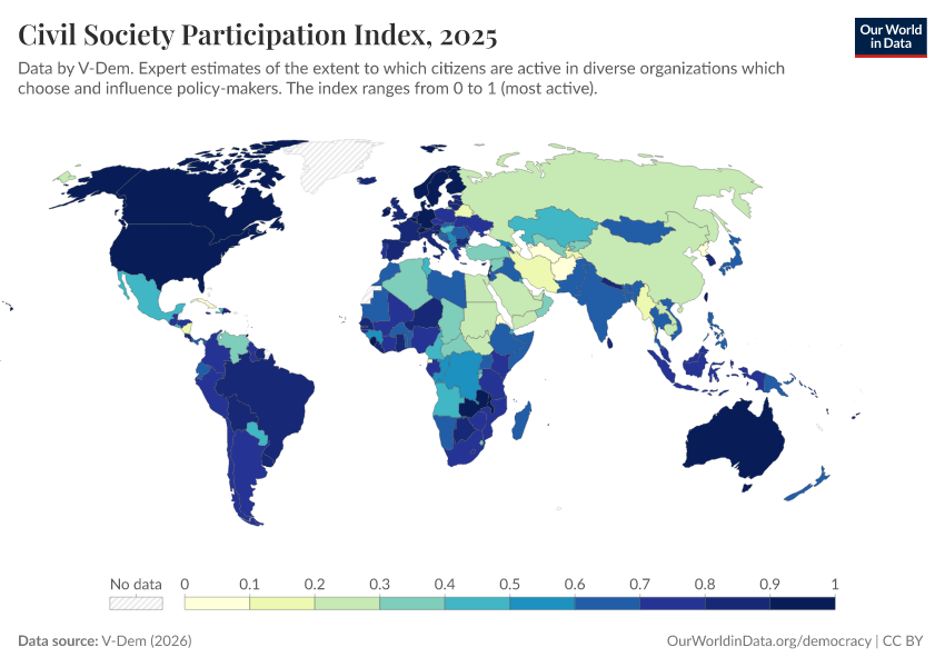 “Data Page: Civil society participation index”, part of the following publication: Bastian Herre, Lucas Rodés-Guirao, and Esteban Ortiz-Ospina (2013) - “Democracy”. Data adapted from V-Dem. Retrieved from https://gfs-wave-2-new.owid.pages.dev:8789/20260402-164039/grapher/civil-society-participation-index.html [online resource] (archived on April 2, 2026).How to cite this data