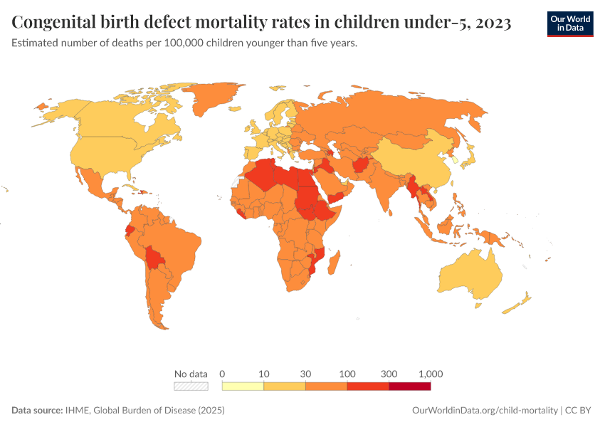 “Data Page: Congenital birth defect mortality rates in children under-5”, part of the following publication: Esteban Ortiz-Ospina and Max Roser (2016) - “Global Health”. Data adapted from IHME, Global Burden of Disease. Retrieved from https://gfs-wave-2-new.owid.pages.dev:8789/20260323-161325/grapher/congenital-birth-defect-mortality-rates-in-children-under-5.html [online resource] (archived on March 23, 2026).How to cite this data