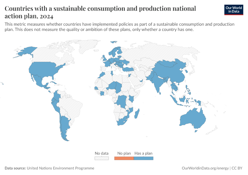 “Data Page: Countries with a sustainable consumption and production national action plan”. Our World in Data (2026). Data adapted from United Nations Environment Programme. Retrieved from https://gfs-wave-2-new.owid.pages.dev:8789/20260304-094028/grapher/country-scp-plan.html [online resource] (archived on March 4, 2026).How to cite this data