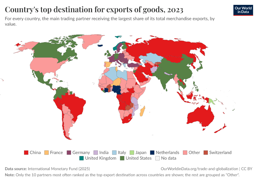 International Monetary Fund (2025) – with major processing by Our World in Data. “Top export partner category” [dataset]. International Monetary Fund, “International Trade in Goods (by partner country) (IMTS)” [original data]. Retrieved April 10, 2026 from https://gfs-wave-2-new.owid.pages.dev:8789/20260304-094028/grapher/countrys-top-destination-for-exports-of-goods.html (archived on March 4, 2026).Download