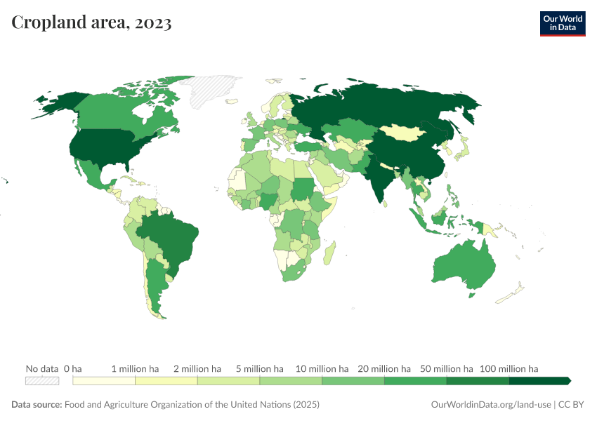 “Data Page: Cropland area”, part of the following publication: Hannah Ritchie, Pablo Rosado, and Max Roser (2023) - “Agricultural Production”. Data adapted from Food and Agriculture Organization of the United Nations. Retrieved from https://gfs-wave-2-new.owid.pages.dev:8789/20260304-094028/grapher/cropland-area.html [online resource] (archived on March 4, 2026).How to cite this data