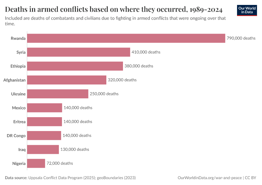 Uppsala Conflict Data Program (2023); Natural Earth (2022) – processed by Our World in Data. “Deaths in armed conflicts based on where they occurred, 1989-2024” [dataset]. Uppsala Conflict Data Program, “Georeferenced Event Dataset (cumulative)”; Natural Earth, “Large scale data (1:10m Cultural Vectors), Admin 0 Countries 5.1.1” [original data]. Retrieved April 10, 2026 from https://gfs-wave-2-new.owid.pages.dev:8789/20260304-094028/grapher/cumulative-deaths-in-armed-conflicts.html (archived on March 4, 2026).Download