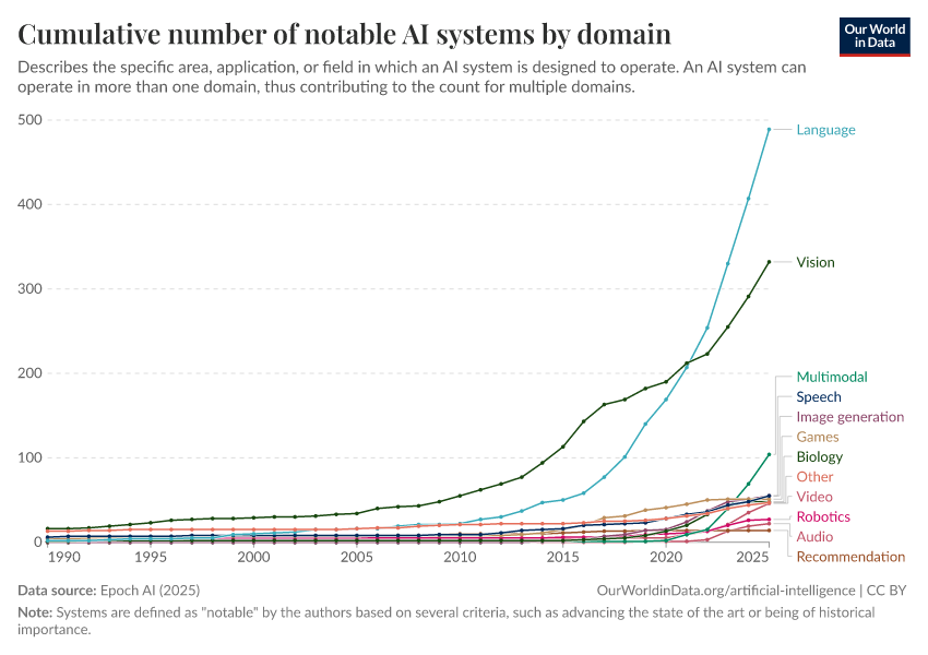 Epoch AI (2025) – with major processing by Our World in Data. “Cumulative number of notable AI systems by domain” [dataset]. Epoch AI, “Parameter, Compute and Data Trends in Machine Learning” [original data]. Retrieved April 10, 2026 from https://gfs-wave-2-new.owid.pages.dev:8789/20260318-110251/grapher/cumulative-number-of-notable-ai-systems-by-domain.html (archived on March 18, 2026).Download