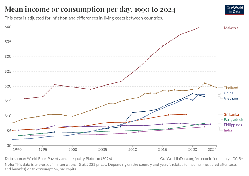 World Bank Poverty and Inequality Platform (2025) – with major processing by Our World in Data. “Mean income or consumption per day – World Bank” [dataset]. World Bank Poverty and Inequality Platform, “World Bank Poverty and Inequality Platform (PIP) 20250930_2021, 20250930_2017” [original data]. Retrieved April 10, 2026 from https://gfs-wave-2-new.owid.pages.dev:8789/20260402-163007/grapher/daily-mean-income.html (archived on April 2, 2026).