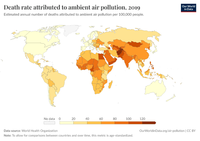 World Health Organization – processed by Our World in Data. “Death rate attributed to ambient air pollution” [dataset]. World Health Organization, “Global Health Observatory (GHO), World Health Organisation (WHO)” [original data]. Retrieved April 10, 2026 from https://gfs-wave-2-new.owid.pages.dev:8789/20260304-094028/grapher/death-rate-ambient-air-pollution.html (archived on March 4, 2026).Download