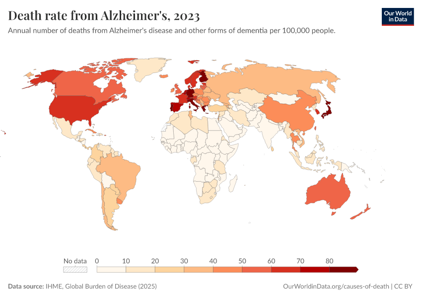 IHME, Global Burden of Disease (2025) – with major processing by Our World in Data. “Death rate from Alzheimer's – IHME” [dataset]. IHME, Global Burden of Disease, “Global Burden of Disease - Deaths” [original data]. Retrieved April 10, 2026 from https://gfs-wave-2-new.owid.pages.dev:8789/20260323-161325/grapher/death-rate-from-alzheimers-other-dementias-gbd.html (archived on March 23, 2026).