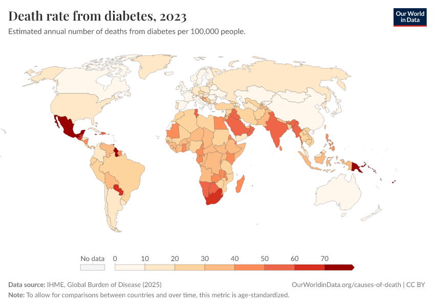 IHME, Global Burden of Disease (2025) – with major processing by Our World in Data. “Death rate from diabetes – IHME” [dataset]. IHME, Global Burden of Disease, “Global Burden of Disease - Deaths” [original data]. Retrieved April 10, 2026 from https://gfs-wave-2-new.owid.pages.dev:8789/20260323-161325/grapher/death-rate-from-diabetes.html (archived on March 23, 2026).