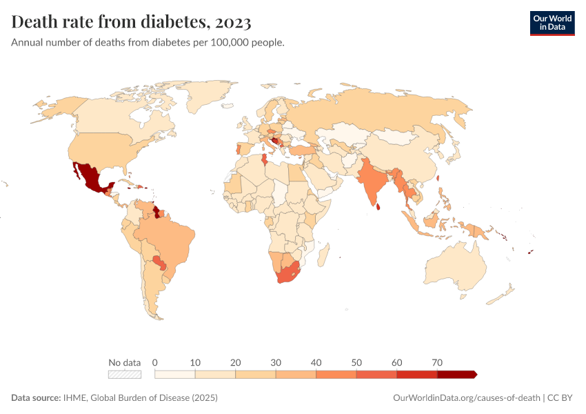 “Data Page: Death rate from diabetes”, part of the following publication: Esteban Ortiz-Ospina and Max Roser (2016) - “Global Health”. Data adapted from IHME, Global Burden of Disease. Retrieved from https://gfs-wave-2-new.owid.pages.dev:8789/20260323-161325/grapher/death-rate-from-diabetes-gbd.html [online resource] (archived on March 23, 2026).How to cite this data