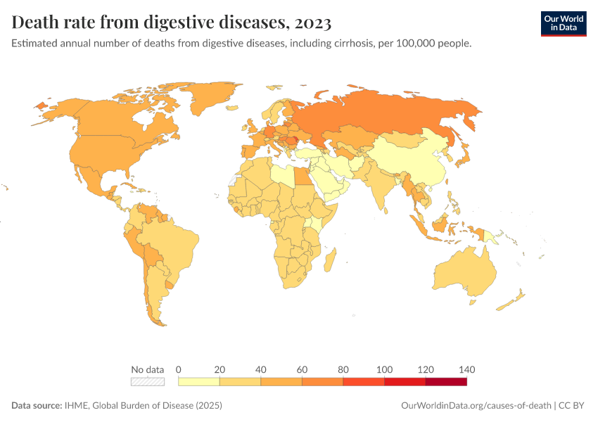 IHME, Global Burden of Disease (2025) – with major processing by Our World in Data. “Death rate from digestive diseases – IHME” [dataset]. IHME, Global Burden of Disease, “Global Burden of Disease - Deaths” [original data]. Retrieved April 10, 2026 from https://gfs-wave-2-new.owid.pages.dev:8789/20260323-161325/grapher/death-rate-from-digestive-diseases-gbd.html (archived on March 23, 2026).