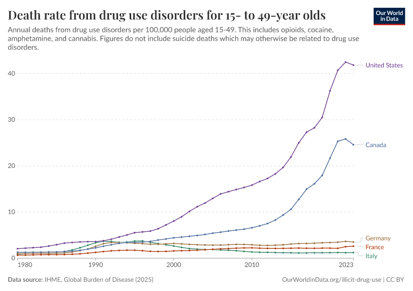 IHME, Global Burden of Disease (2025) – with major processing by Our World in Data. “Death rate from drug use disorders for 15- to 49-year olds – IHME” [dataset]. IHME, Global Burden of Disease, “Global Burden of Disease - Deaths” [original data]. Retrieved April 10, 2026 from https://gfs-wave-2-new.owid.pages.dev:8789/20260323-161325/grapher/death-rate-from-drug-use-disorders-for-15--to-49-year-olds.html (archived on March 23, 2026).