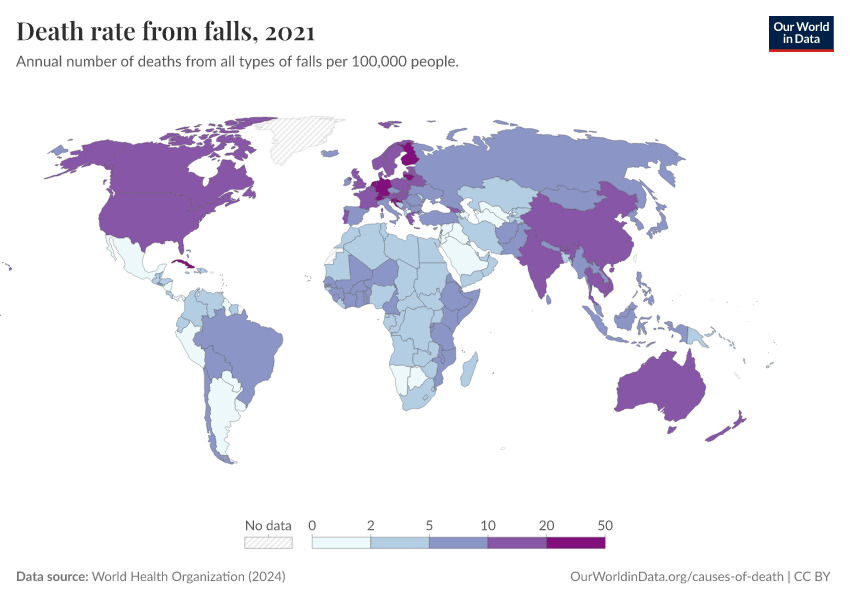 World Health Organization (2024) – with major processing by Our World in Data. “Death rate from falls” [dataset]. World Health Organization, “Global Health Estimates” [original data]. Retrieved April 10, 2026 from https://gfs-wave-2-new.owid.pages.dev:8789/20260325-171315/grapher/death-rate-from-falls.html (archived on March 25, 2026).Download