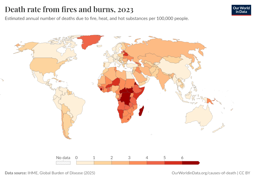 IHME, Global Burden of Disease (2025) – with major processing by Our World in Data. “Death rate from fires and burns – IHME” [dataset]. IHME, Global Burden of Disease, “Global Burden of Disease - Deaths” [original data]. Retrieved April 10, 2026 from https://gfs-wave-2-new.owid.pages.dev:8789/20260323-161325/grapher/death-rate-from-fires-and-burns-ihme.html (archived on March 23, 2026).